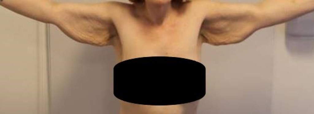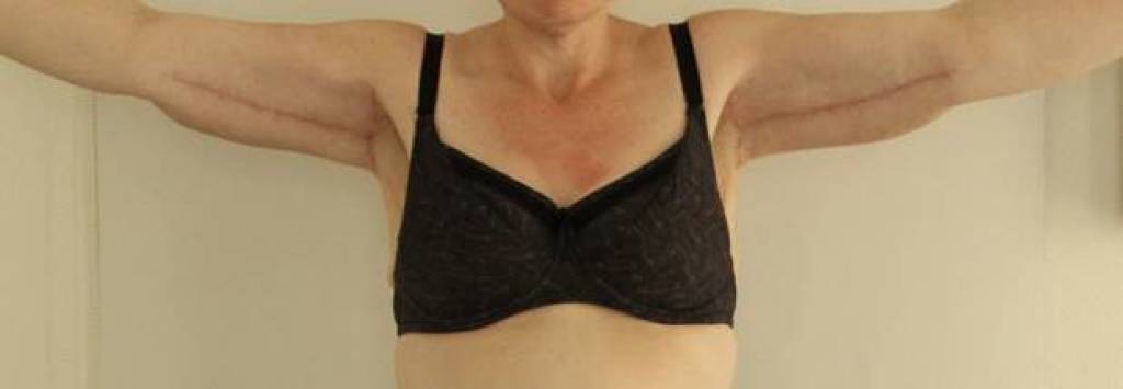 Før- og efter fotos. Der er fjernet 11 cm hud på bredeste sted. Arrene er placeret på indersiden af overarmene for at skjule dem mindst mulig. Med tiden bliver arrene blege og mere utydelige.