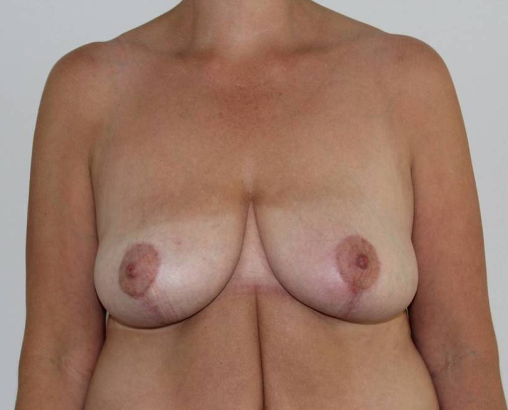 Patienten ønskede korrektion og mere fylde, hvilket blev opnået ved en 2-stadie operation med først brystløft og -korrektion, dernæst silikoneimplantater på 370 ml med placering under brystmusklerne. (Patienten har også fået lavet maveplastik med lodret ar).